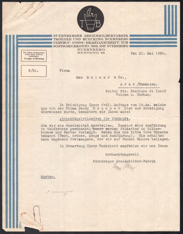 1930 Nürnbergi címkegyár levele és lehúzható vasalható címkék harisnyához minták