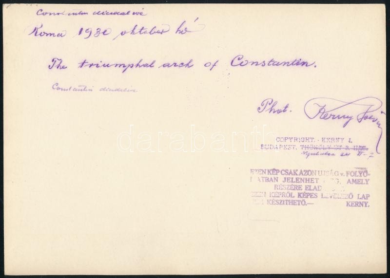1930 Róma, Constantinus császár diadalíve, Kerny István (1879-1963) budapesti fotóművész hagyatékából 1 db vintage fotó, feliratozva, aláírva, pecséttel jelzett, ezüstzselatinos fotópapíron, 16×22,5 cm<a href="https://www.darabanth.com/hu/gyorsarver
