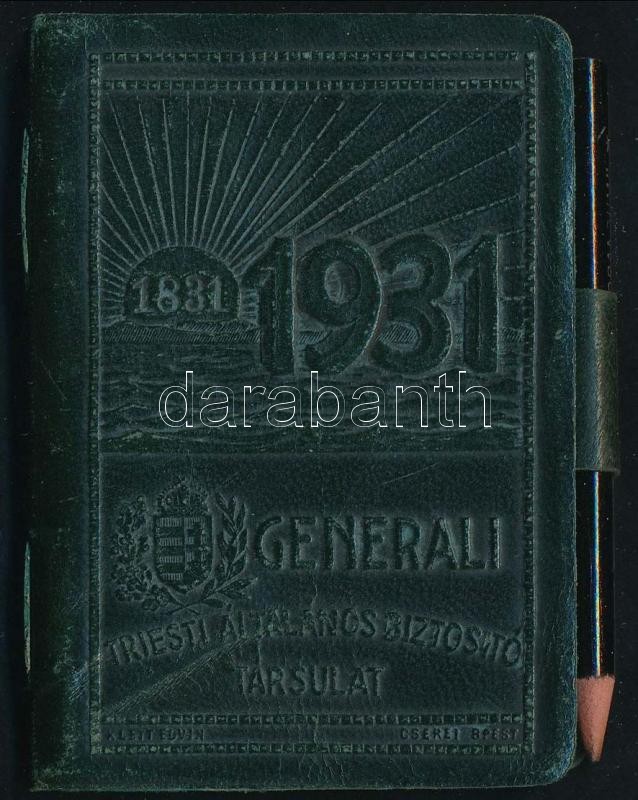 1931 Generali Biztosító zsebnaptár ceruzával, dombornyomott bőr kötésben<a href="https://www.darabanth.com/hu/gyorsarveres/413/kategoriak~Mutargy-papirregiseg-egyeb/Nyomtatvanyok~1000002/1931-Generali-Biztosito-zsebnaptar-ceruzaval-dombornyomott-bor