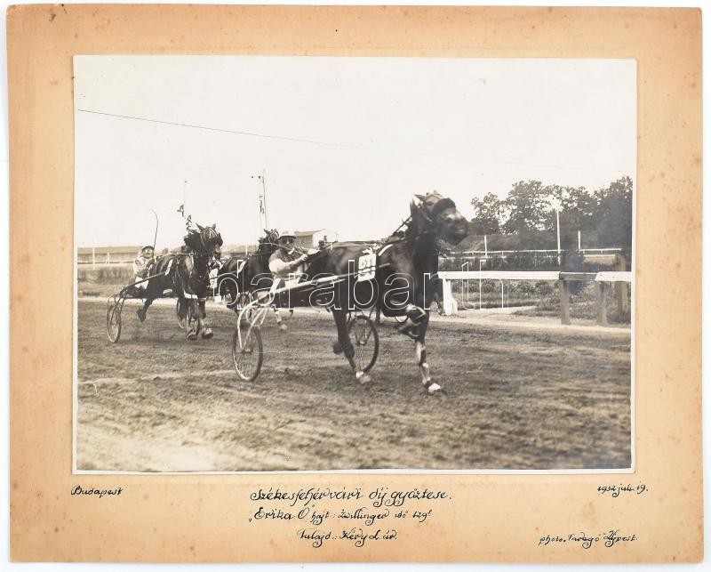1932 Budapet, lóverseny, a székesfehérvári díj győztese ‘Erika’, hajtó: Zwillinger, kartonra kasírozott fotó, feliratozva, 17×23 cm<a href="https://www.darabanth.com/hu/nagyaukcio/38/kategoriak~Mutargy-szobor-papirregiseg/Foto~15584/1932-Budapet-lov