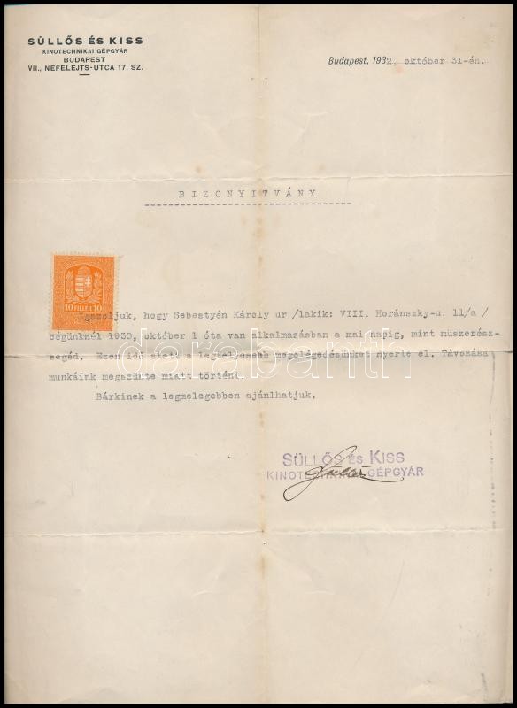 1932 Süllős és Kiss Kinotechnikai Gépgyár bizonyítványa műszerészsegéd részére, fejléces papíron, 1932. okt. 31, hajtott, okmánybélyeggel, aláírással, kis szakadásokkal.<a href="https://www.darabanth.com/hu/gyorsarveres/424/kategoriak~Mutargy-papirr