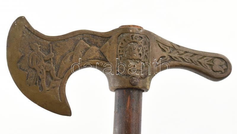 1933 Cserkészfokos, ‘Hungáry 1933’, feliratokkal, a fokos egyik oldalán ‘makk motívum’ , a másik oldalán csikós lovon, mögötte gémeskúttal díszítve, réz, jelzés nélkül, kopott, 15×7 cm, pálca pótolt h: 80 cm<a href="https://www.darabanth.com/hu/gyor