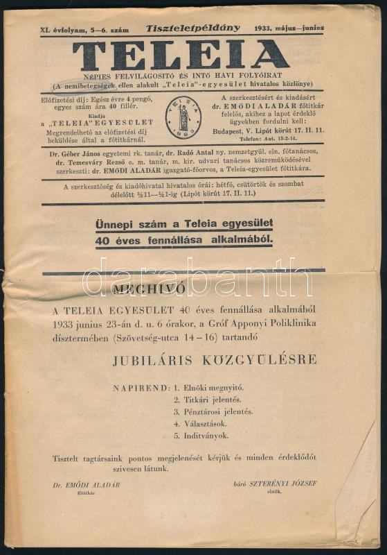 1933 Teleia Népies Felvilágosító és Intő Havi Folyóirat XI. évf. 5-6. szám tiszteletpéldány, 104p