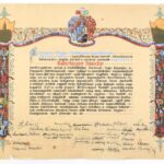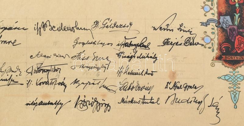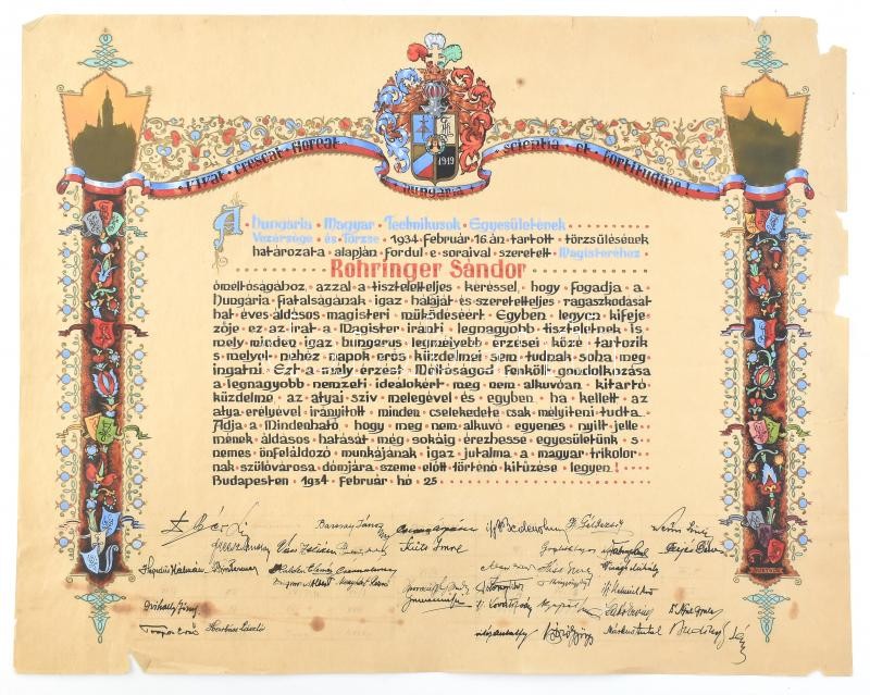 1934 Rohringer Sándor (1868, Kassa-1945, Budapest) vízépítő mérnök, egyetemi tanár, a Magyar Tudományos Akadémia később rendes tagja részére kiállított egyedi, festett emléklap, végén irredenta szöveggel. A Hungária Magyar Technikusok Egyesületének Vezérs