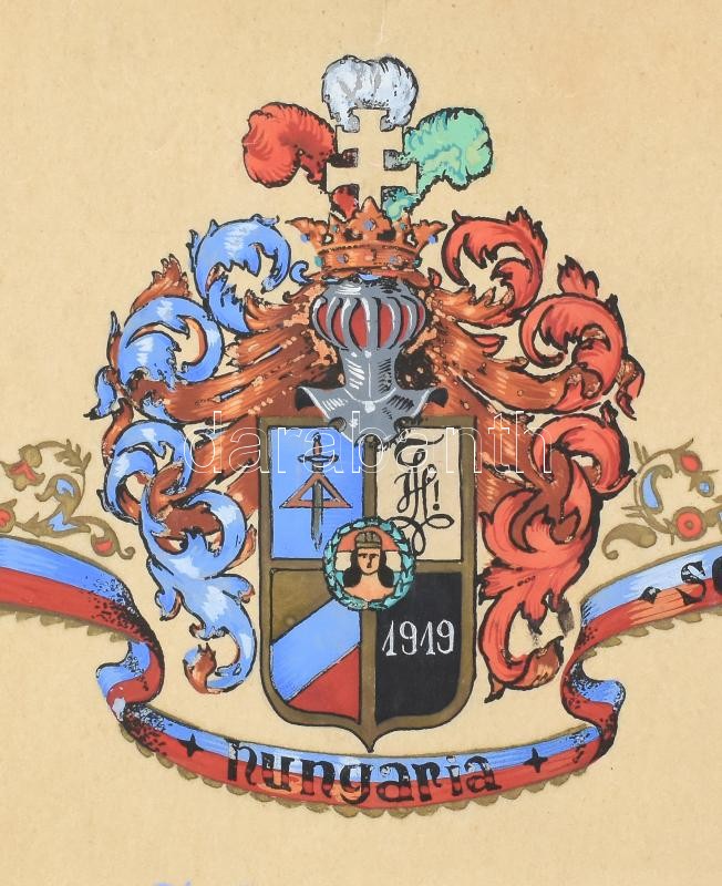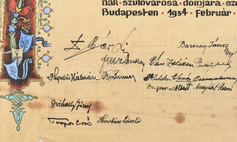 1934 Rohringer Sándor (1868, Kassa-1945, Budapest) vízépítő mérnök, egyetemi tanár, a Magyar Tudományos Akadémia később rendes tagja részére kiállított egyedi, festett emléklap, végén irredenta szöveggel. A Hungária Magyar