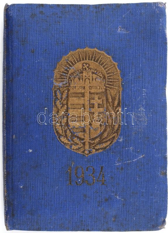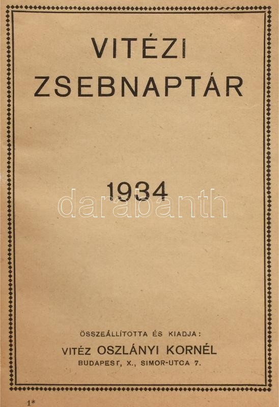 1934 Vitézi zsebnaptár. Összeáll. és kiadja: vitéz Oszlányi Kornél. Bp., Pallas-ny., 1 (címkép, Horthy Miklós arcképe) + 399 p. Kiadói aranyozott egészvászon-kötés, az elülső táblán aranyozott vitézi címerrel, kopott