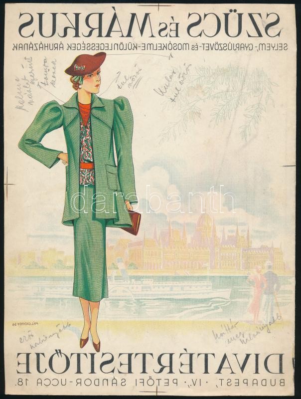 1936 Szűcs és Márkus divatértesítője, Pál György (1906-1986) grafikája, nyomdai negatív nyomat, 25,5×19,5 cm<a href="https://www.darabanth.com/hu/gyorsarveres/411/kategoriak~Mutargy-papirregiseg-egyeb/Nyomtatvanyok~1500002/1936-Szucs-es-Markus-divat