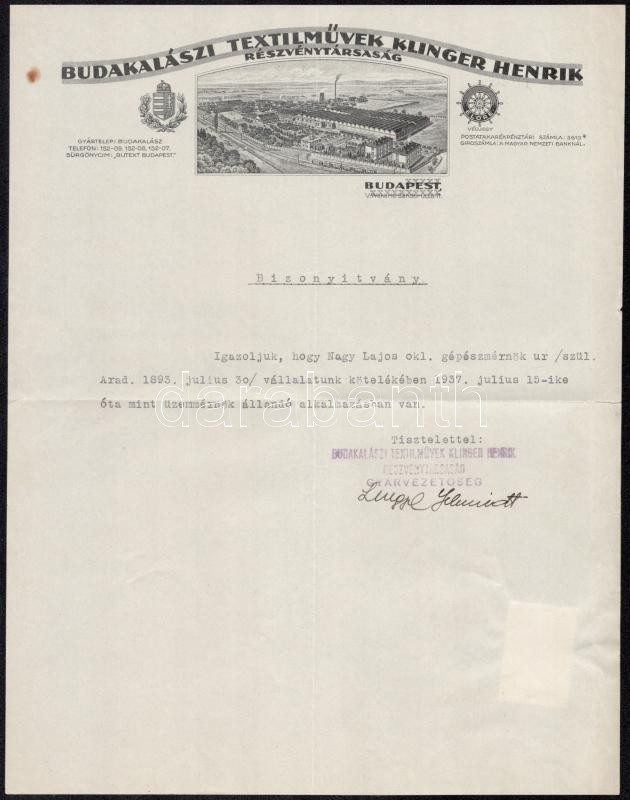 1937 Budakalászi Textilművek Klinger Henrik Rt. munkáltatói igazolása, a cég fejléces papírján<a href="https://www.darabanth.com/hu/gyorsarveres/412/kategoriak~Mutargy-papirregiseg-egyeb/Okmanyok~500018/1937-Budakalaszi-Textilmuvek-Klinger-Henrik-Rt
