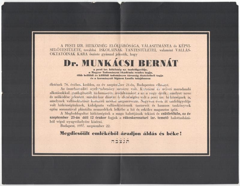 1937 Munkácsi Bernát (1860-1937) nyelvész, néprajztudós, MTA tag, a pesti izr. hitközség ny. tanfelügyelőjének halálozási értesítője, hajtott.