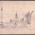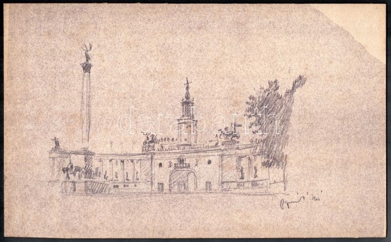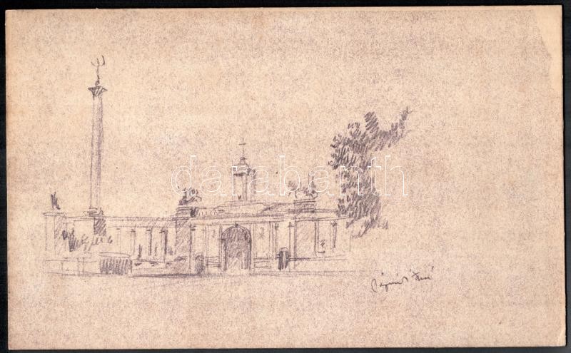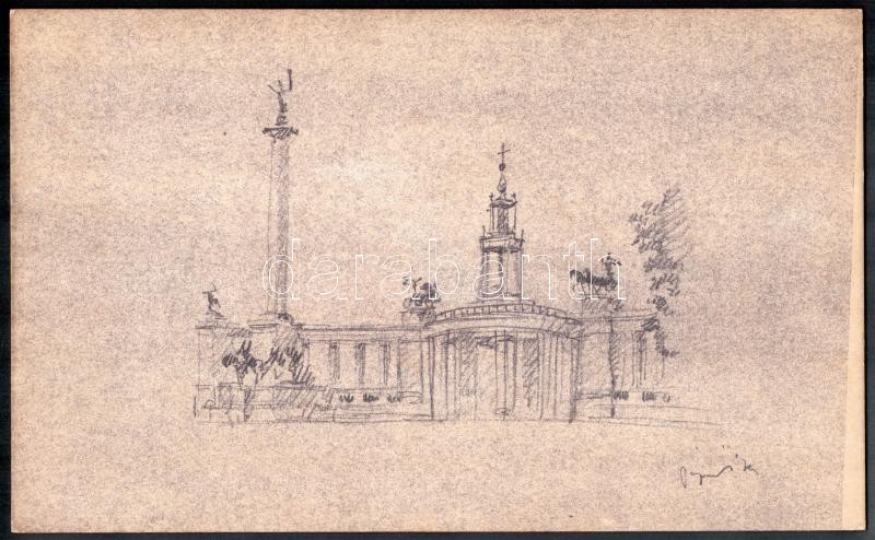 1938-as Eucharisztikus Világkongresszus Hősök terei főoltáráról, díszletéről készült 5 db látványterv. Nyomat. karton. Olvashatatlan jelzéssel a nyomaton. 20×32 cm.