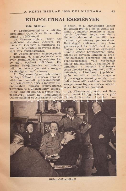 1938 Pesti Hírlap Naptára. Bp., Légrády. Gazdag képanyaggal illusztrált. Benne a kor eseményeivel, ismert személyeivel, pl.: Horthy, Mussolini, Hitler. Kissé kopott papírkötés, kissé sérült elülső borítóval.