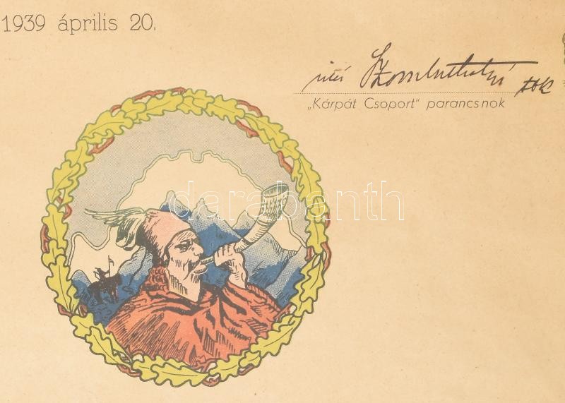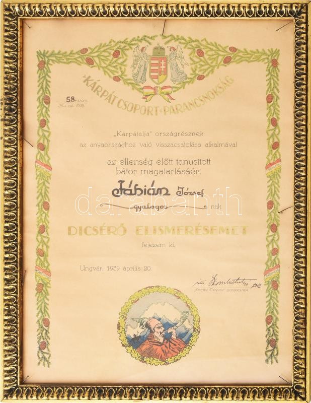 1939 Kárpát Csoport Parancsnokság dicsérő oklevele gyalogos részére, „Kárpátalja” országrésznek az anyaországhoz való visszacsatolása alkalmával az ellenség előtt tanúsított magatartásáért, Ungvár, 1939. április. 30. Vitéz Szombathelyi Ferenc (1887-1946)