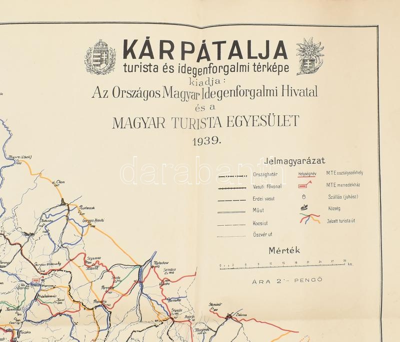 1939 Kárpátalja turista és idegenforgalmi térképe, kiadja az Országos Magyar Idegenforgalmi Hivatal és az Magyar Turista Egyesület, 54×73 cm<a href="https://www.darabanth.com/hu/gyorsarveres/417/kategoriak~Mutargy-papirregiseg-egyeb/Terkepek~30/1939