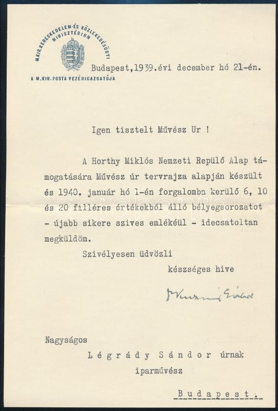 1939 Kuzmich Gábor (1886-1958) a M. Kir. Posta vezérigazgatójának, a M. Kir. Kereskedelem- és Közlekedésügyi Minisztérium Államtitkárának gépelt levele Légrády Sándor (1906-1987) grafikus részére, hogy a megjelent bélyegek