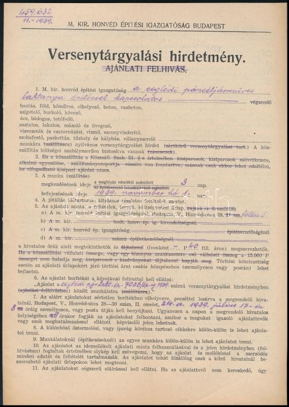 1939 M. Kir. Honvéd Építési Igazgatóság versenytárgyalási hirdetmény