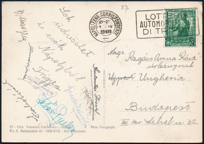 1939 Nápolyi sport bajnokságról küldött levelezőlap 8 magyar sportoló aláírásával, közötte Szabó Lóránt ökölvívó.
