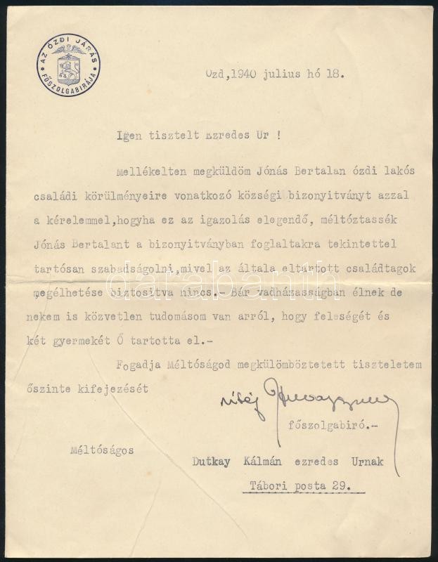 1940 Ózd, vitéz Hubay Gyula főszolgabíró levele Dutkay Kálmán ezredesnek, saját kezű aláírásával<a href="https://www.darabanth.com/hu/gyorsarveres/413/kategoriak~Mutargy-papirregiseg-egyeb/Okmanyok~500018/1940-Ozd-vitez-Hubay-Gyula-foszolgabiro-leve