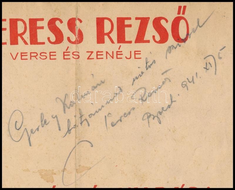 1941 Seress Rezső (1899-1968) zeneszerző, zongorista autográf aláírása, két általa szerzett dal (Gyerünk Bodri kutyám…; Komáromi polgármester leánya) nyomtatott kottáján, kissé foltos, szakadt<a href="https://www.darabanth.com/hu/nagyaukcio/38/kat