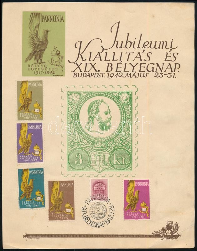 1942 XIX. Bélyegnap, kiállítás Pannóniai Bélyegegyesület emléklapja levélzárókkal