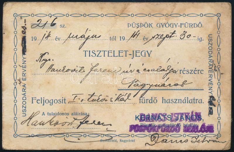 1944 Püspök gyógyfürdő jegy, kissé koszos