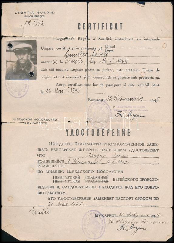 1945 bukaresti svéd konzulátus magyar származású zsidó számára kiállított két nyelvű fényképes igazolványa. Sérült, szakadt<a href="https://www.darabanth.com/hu/gyorsarveres/415/kategoriak~Mutargy-papirregiseg-egyeb/Judaika~500025/1945-bukaresti-sve