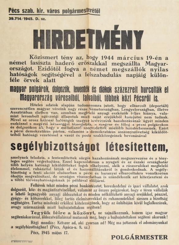 1945 Pécs, deportáltak visszahozatalára alakult bizottságról szóló felhívás hirdetmény. 40×60 cm