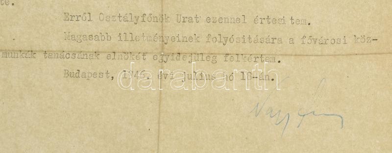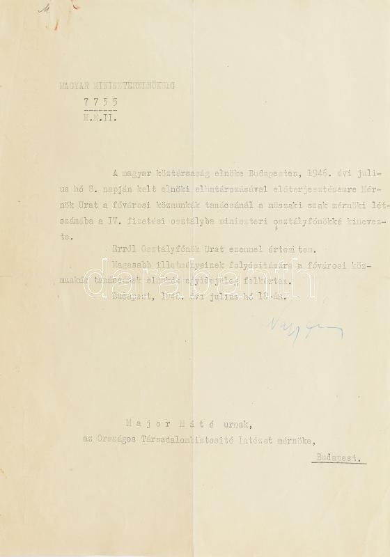 1946 Nagy Ferenc (1903-1979) miniszterelnök gépelt levele Major Máté (1904-1986) Kossuth-díjas építész részére, melyben a Fővárosi Közmunkák Tanácsánál a műszaki szak mérnöki létszámába a IV. fizetési osztályba miniszteri osztályfőnökké lépteti elő, 1946.