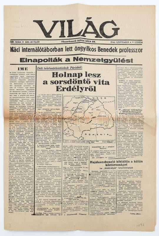 1946. szeptember 4.. A Világ című újság 380. száma, címlapon ‘Holnap lesz a sorsdöntő vita Erdélyről’