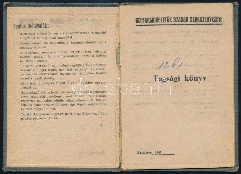 1947 Bp., Gépjárművezetők Szabad Szakszervezete tagsági könyv, sok bélyeggel<a href="https://www.darabanth.com/hu/gyorsarveres/421/kategoriak~Mutargy-papirregiseg-egyeb/Okmanyok~500018/1947-Bp-Gepjarmuvezetok-Szabad-Szakszervezete-tagsagi-konyv-sok-