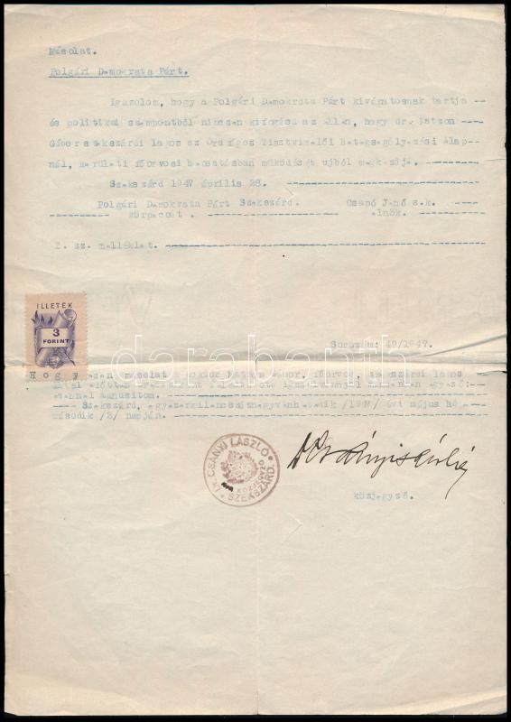 1947 Szekszárd, közjegyző által hitelesített másolat a Polgári Demokrata Párt igazolásáról<a href="https://www.darabanth.com/hu/gyorsarveres/412/kategoriak~Mutargy-papirregiseg-egyeb/Okmanyok~500018/1947-Szekszard-kozjegyzo-altal-hitelesitett-masola