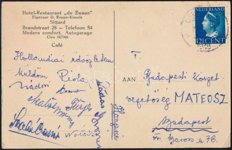 1948 A MATEOSZ labdarúgói által Hollandiából küldött képeslap rajta az Aranycsapat játékosának Grosics Gyulának és a többi játékos aláírásával / Autograph signed postcard of the Mateosz Hungarian football team inc. Gyula Grosics