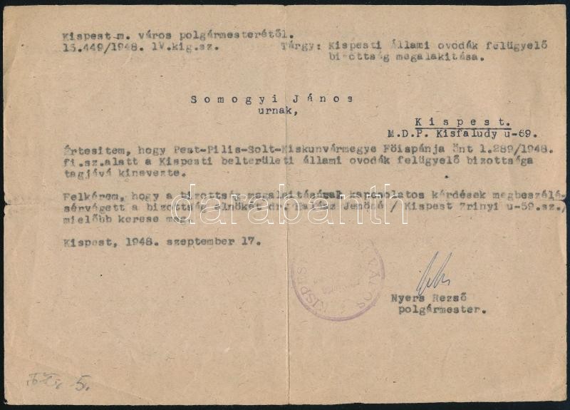 1948 Nyers Rezső (1898-1956), Kispest polgármestere (Nyers Rezső (1923-2018) politikus, a második Kádár-kormány pénzügyminiszterének édesapja) saját kezűleg aláírt levele, Kispesti állami óvodák felügyelőbizottsága tagsági kinevezés tárgyában, pecséttel,