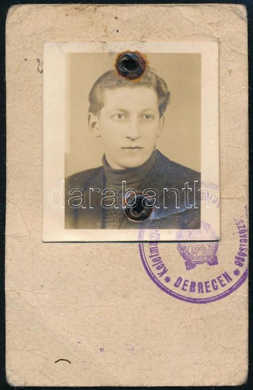 1949 Debrecen, a Magyar Labdarúgók Szövetsége – Keletmagyarországi Labdarúgók Alszövetsége által kiállított fényképes játékosigazolvány őszi úttörő bajnokságra, bélyegzőkkel<a href="https://www.darabanth.com/hu/gyorsarveres/413/kategoriak~Mutargy-pa