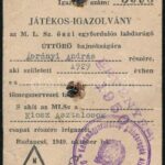 1949 Debrecen, a Magyar Labdarúgók Szövetsége – Keletmagyarországi Labdarúgók Alszövetsége által kiállított fényképes játékosigazolvány őszi úttörő bajnokságra, bélyegzőkkel