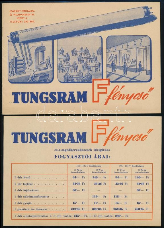 1949 Tungsram F fénycső. Illusztrált reklám nyomtatvány, 8p, kiadói papírkötés, 14×20 cm + Tungsram F fénycső és segédberendezések ideiglenes fogyasztói árai, egy oldalas nyomtatvány, 14×20 cm<a href="https://www.darabanth.com/hu/gyorsarveres/413/ka