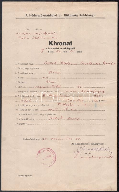 1954 Hódmezővásárhelyi Izr. Hitközség Rabbisága, kivonat a halálozási anyakönyvből, az 1930-ban Teltsch Adolfné Asuländer Erzsébet nevére kiállítva (Telcs, szül. Teltsch Ede szobrász rokona?), rabbi olvashatatlan aláírásával, fejléces papíron, hajtásnyomm