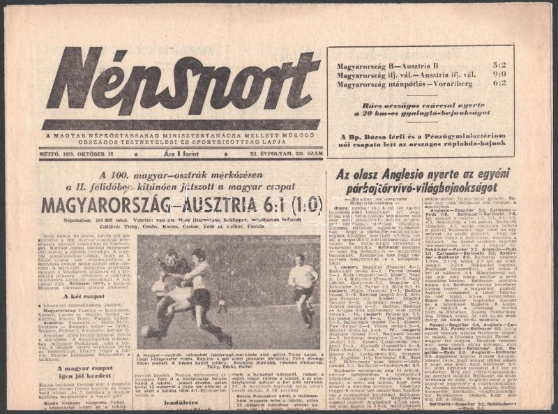 1955 Népsport október 17-i száma, benne tudósítás a 100. magyar-osztrák labdarúgó mérkőzésről, az Aranycsapat tagjaival<a href="https://www.darabanth.com/hu/gyorsarveres/419/kategoriak~Mutargy-papirregiseg-egyeb/Nyomtatvanyok~1000002/1955-Nepsport-o