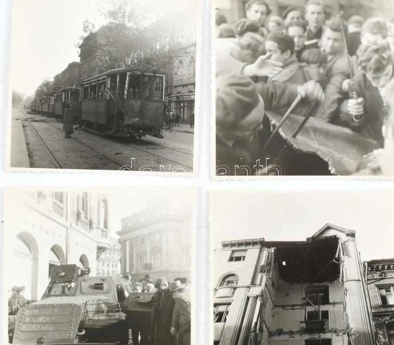 1956 Budapest, életképek a forradalomból, szétlőtt házak, tank, villamos, 8 db fotó, 11×11 cm<a href="https://www.darabanth.com/hu/nagyaukcio/38/kategoriak~Mutargy-szobor-papirregiseg/Foto~15584/1956-Budapest-eletkepek-a-forradalombol-szetlott-hazak