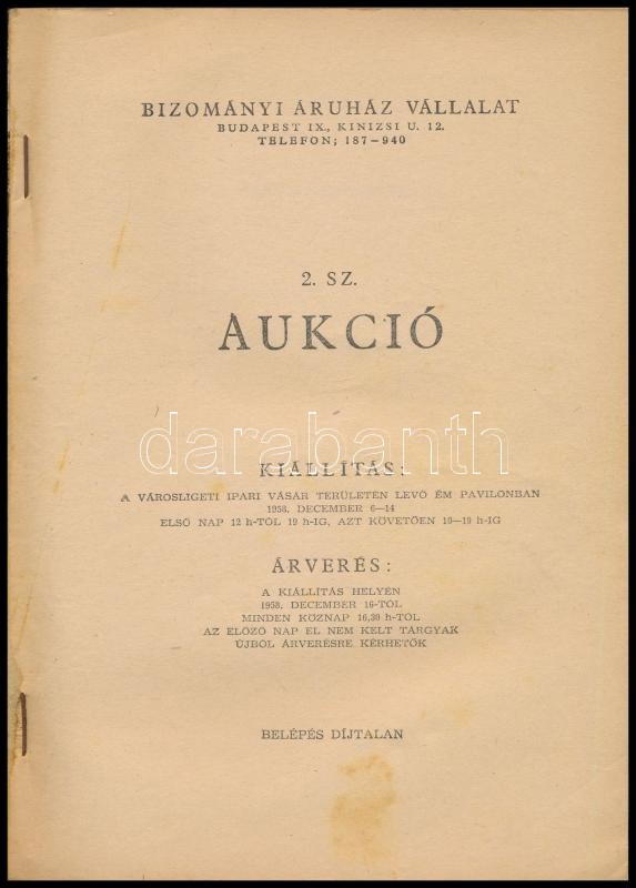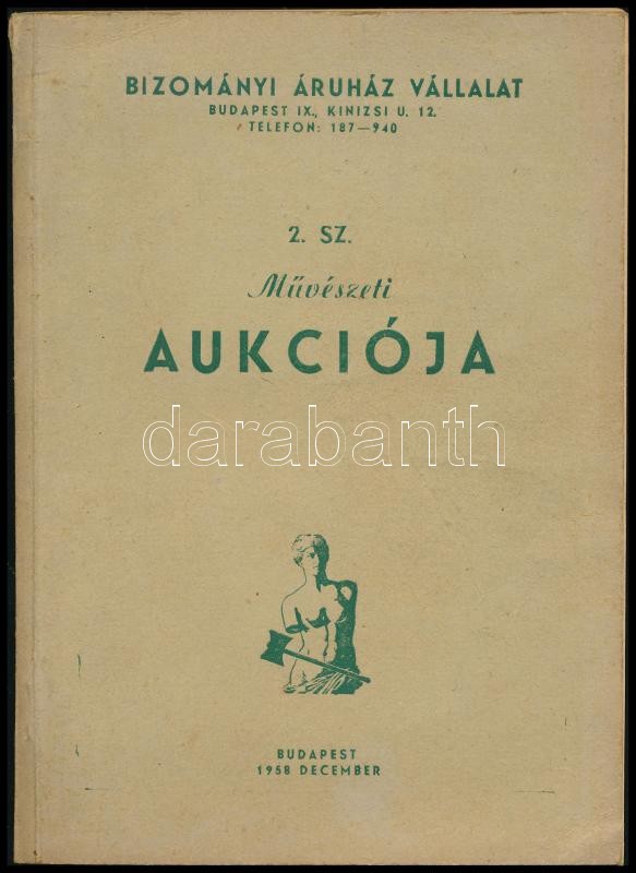 1958 Bizományi Áruház Vállalat (BÁV) 2. sz. művészeti aukciója. Bp., 1958.,’Pátria’-ny., 52+12 p.+32 (fekete-fehér képtáblák) t. + Függelék, rajta kikiáltási árakkal, 2,5 gépelt oldal, 2 sztl. lev. Kiadói papírkötés.<a href="https://www.darabanth.co