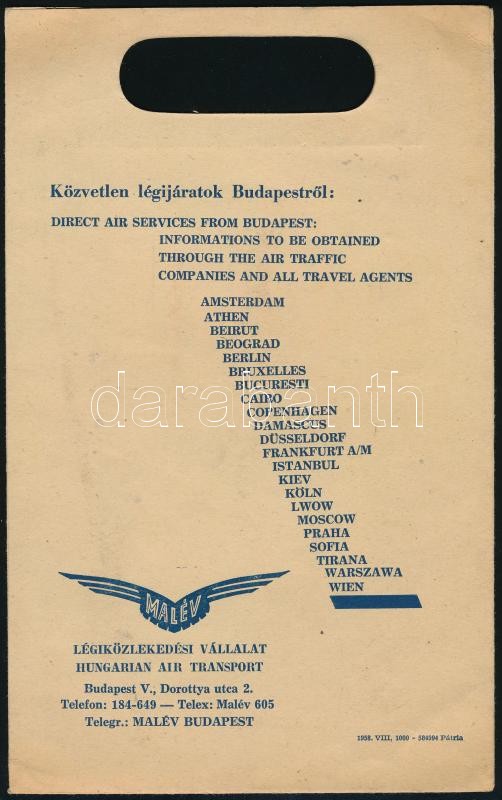 1958 Malév papír tasak, másik oldalán a budapesti IX. Úszó, Műugró, Vízilabda Európa-bajnokság illusztrált hirdetésével, 26×16,5 cm<a href="https://www.darabanth.com/hu/gyorsarveres/412/kategoriak~Mutargy-papirregiseg-egyeb/Reklam~500022/1958-Malev-