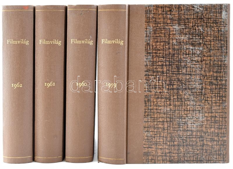 1959-1962 Filmvilág filmművészeti folyóirat II-V., teljes évfolyamai, évfolyamonként félvászon-kötésekben, nagyrészt jó állapotban.<a href="https://www.darabanth.com/hu/gyorsarveres/415/kategoriak~Mutargy-papirregiseg-egyeb/Nyomtatvanyok~1500002/195