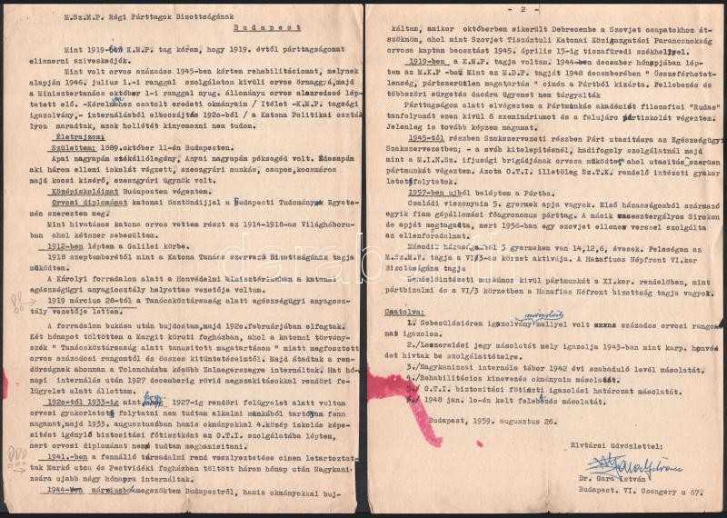 1959 Bp., Dr. Gara István egy hithű kommunista kérvénye, önéletrajza, két gépelt oldal, aláírásával