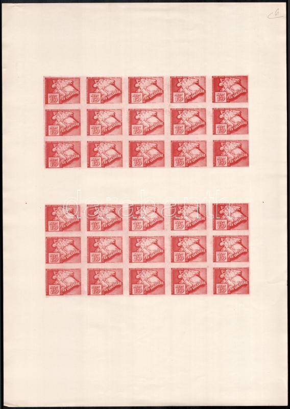 1959 Légrády Sándor: 75 éves a LEHE piros levélzáró próbanyomat teljes ív 2 x 15 fogazatlan levélzárót tartalmaz / Proof imperforate sheet in red colour<a href="https://www.darabanth.com/hu/nagyaukcio/38/kategoriak~Kulfoldi-filatelia-es-postatortene