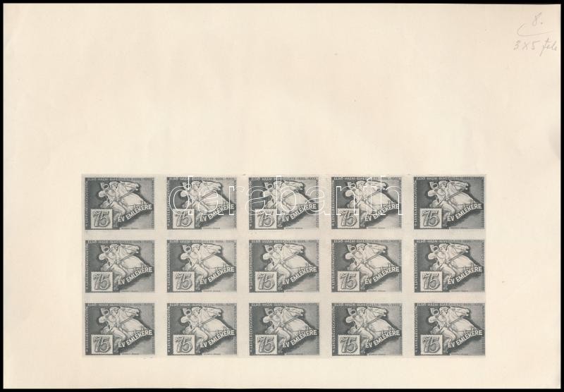 1959 Légrády Sándor: 75 éves a LEHE szürke levélzáró próbanyomat 15-ös ív / proof sheet of 15 labels by Legrady<a href="https://www.darabanth.com/hu/nagyaukcio/38/kategoriak~Kulfoldi-filatelia-es-postatortenet/Parafilatelia~15579/1959-Legrady-Sandor
