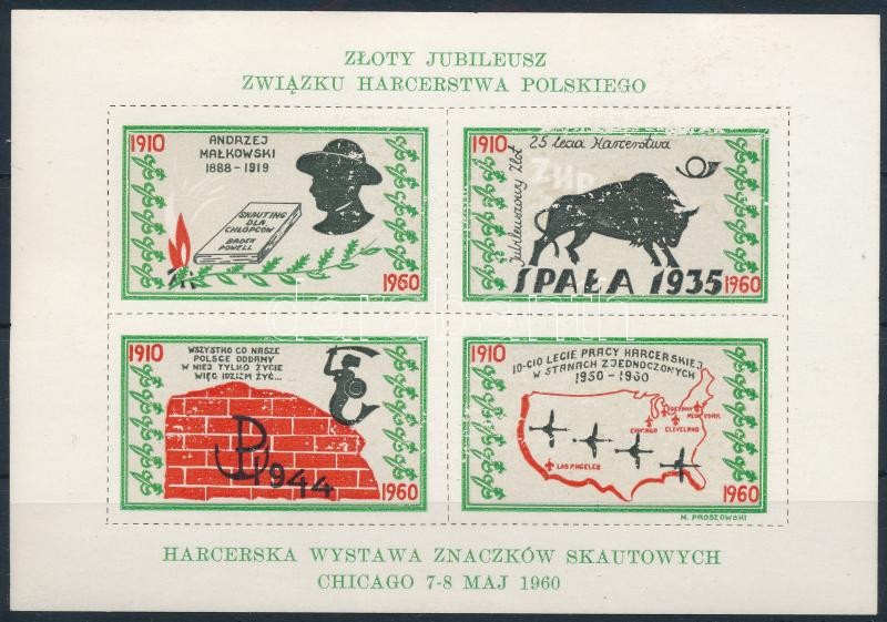 1960 50 éves a lengyel cserkészmozgalom, chicagoi cserkész bélyeg kiállítás levélzáró kisív (előoldali képhiány / demaged on front side)<a href="https://www.darabanth.com/hu/gyorsarveres/410/kategoriak~Mutargy-papirregiseg-egyeb/Cserkesz~500027/1960