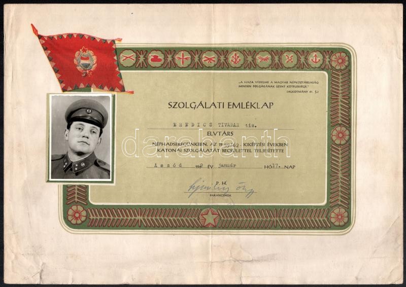 1962 Magyar Néphadsereg fényképes szolgálati emléklap, hajtva, kis szakadással, gyűrődésekkel<a href="https://www.darabanth.com/hu/gyorsarveres/417/kategoriak~Mutargy-papirregiseg-egyeb/Militaria~29/1962-Magyar-Nephadsereg-fenykepes-szolgalati-emlek