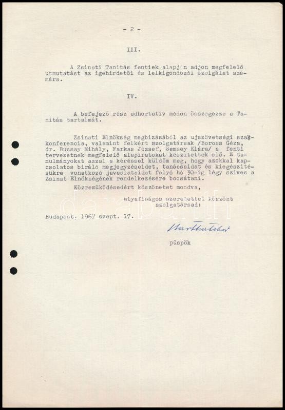 1967 Bartha Tibor református püspök, képviselő által aláírt hivatalos levél