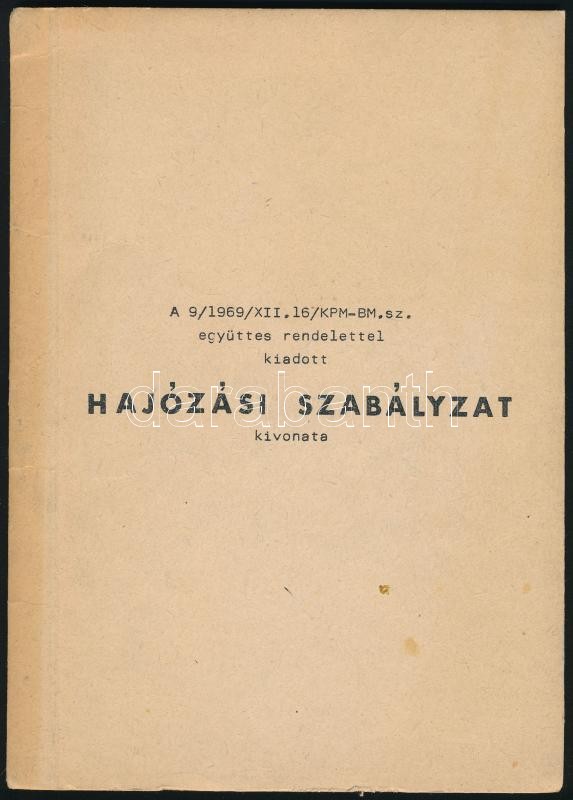 1969 Hajózási szabályzat kivonata. Kiadja a KPM Hajózási Főosztály Hajózási és Kikötői Felügyelete (MAHART-ny.), 33 p. + 10 t. Fekete-fehér ábrákkal. Kiadói papírkötésben. Megjelent 3500 példányban.<a href="https://www.darabanth.com/hu/gyorsarveres/