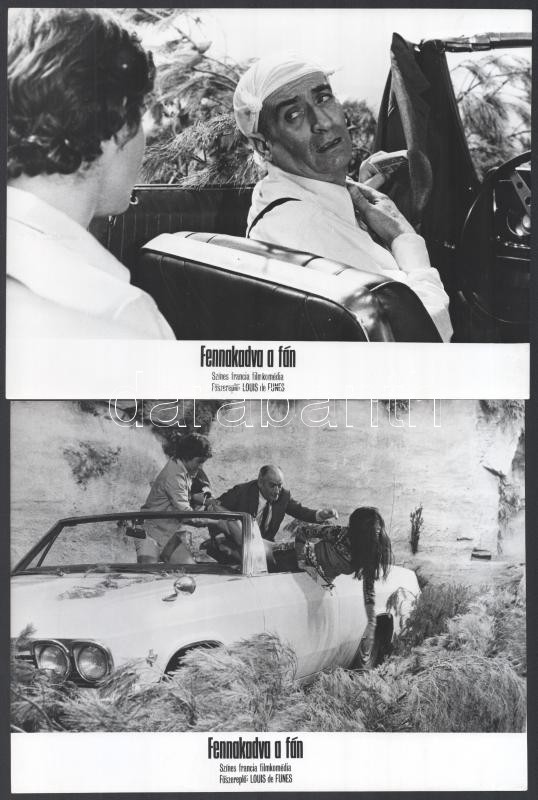 1970 ,,Fennakadva a fán’ című francia film jelenetei és szereplői (köztük Louis de Funes, Gereldine Chaplin), 13 db vintage produkciós filmfotó, ezüst zselatinos fotópapíron, a használatból eredő kisebb hibákkal, + hozzáadva 1 db szöveges kisplakát, 18×24