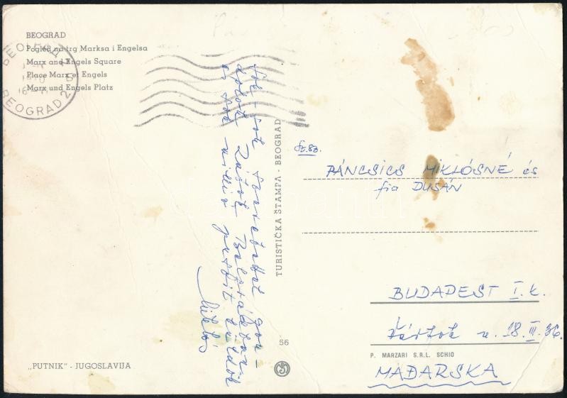 1970 Páncsics Miklós olimpiai bajnok labdarúgó által Belgrádból írt autográf képeslap / Autograph postcard of Miklos Pancsics, olympic champion football player.<a href="https://www.darabanth.com/hu/nagyaukcio/38/kategoriak~Mutargy-szobor-papirregise